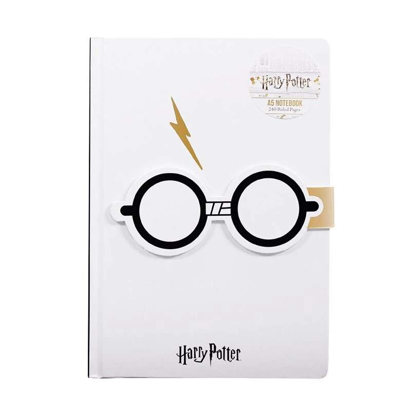 This Harry Potter A5 notebook is perfect for lists, notes and defence against the dark arts revision! The hardback front cover is a crisp white and features the Harry Potter logo at the bottom of the cover in contrasting black, Harry’s iconic scar in gold detailing, and 3D effect glasses that act as a magnetic closure for the notebook when it’s not in use! Inside, each of the 240 ruled 80 gsm pages feature corner Harry Potter logo details, while the initial inside pages also include a repeating Harry Potter glasses and lightning bolt scar design against a grey background.